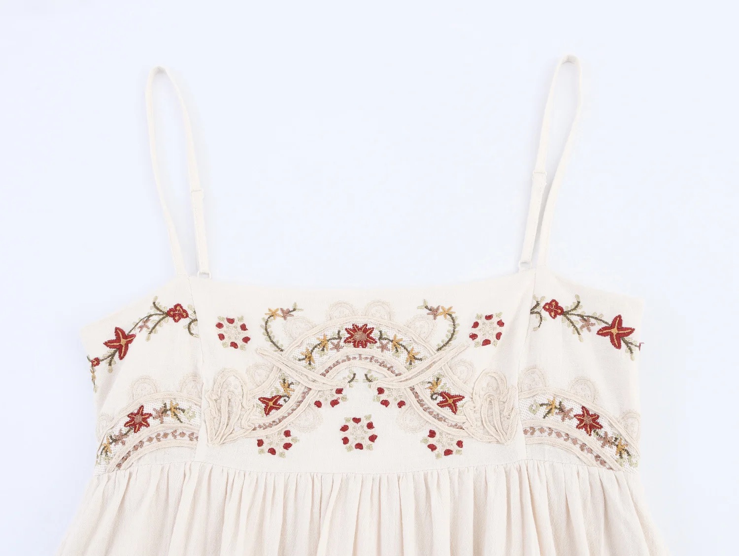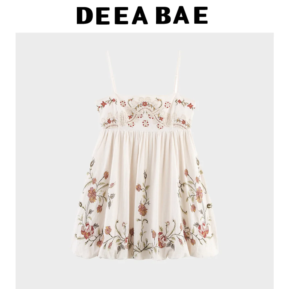 DEEABAE Women's Summer New Fashion Style Waist Collection Cotton Embroidered Strap Short Dress