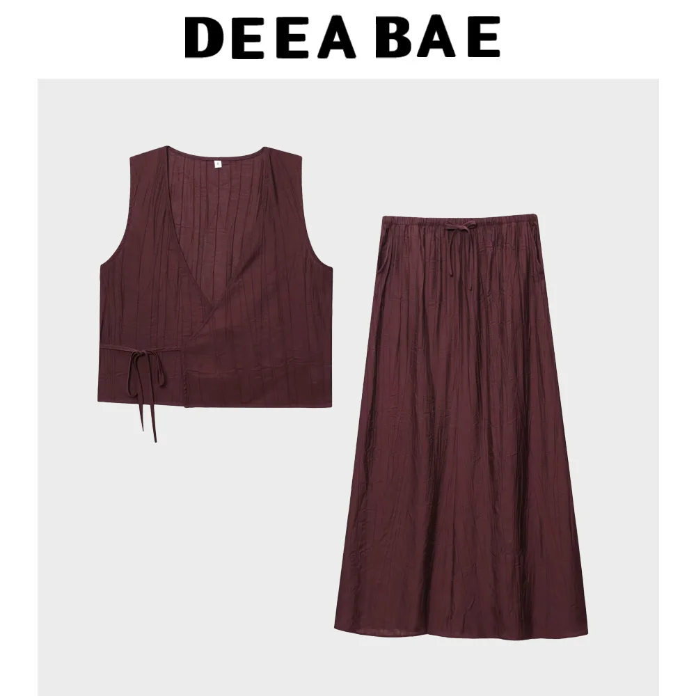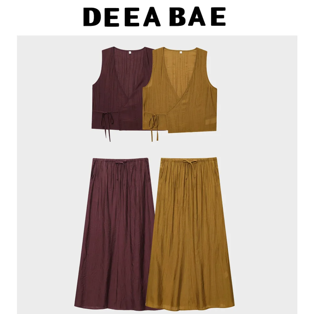 DEEABAE Women's summer new style temperament simple wrinkle effect vest top casual mid waist MIDI skirt set