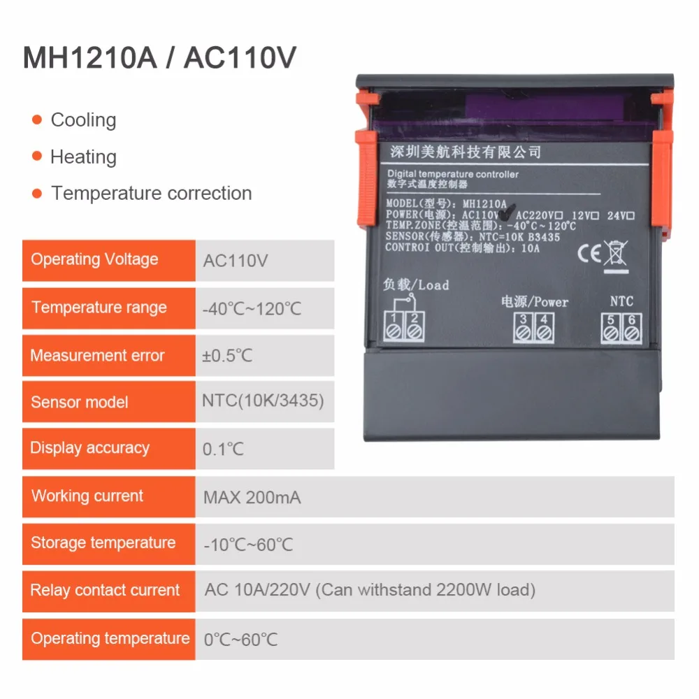 Digital Temperature Controller MH1210A DC12V AC110V AC220V Mini Digital LED Thermostat Temperature Controller with Sensor Probe