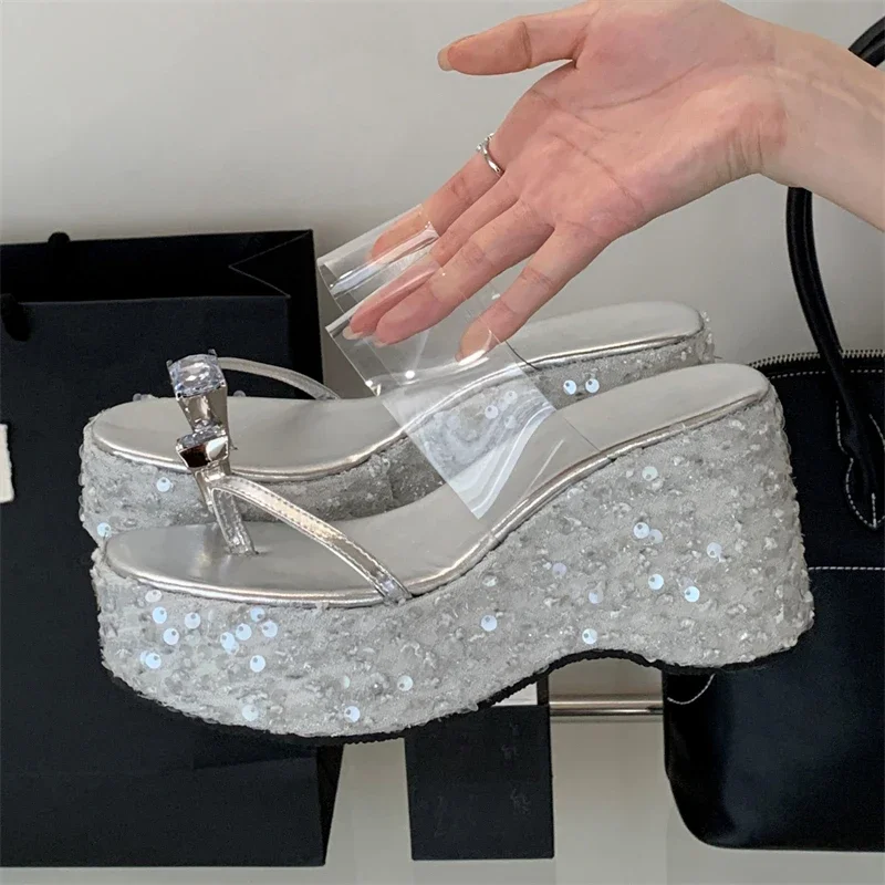 • Eilyken Designer Crystal Sequin Cloth Platform Wedge Slippers Women Street Style Clip Toe High Heels Banquet Summer Shoes