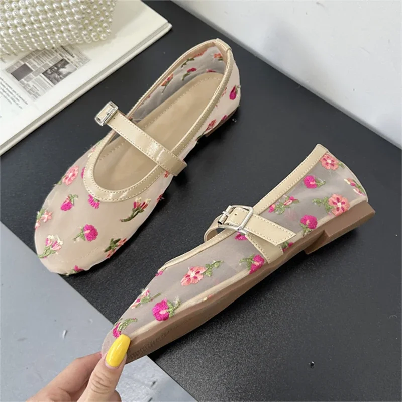 Eilyken Designer Embroidered Flower Mesh Fabric Flat Heels Women Sandals Fashion Round Toe Buckle Strap Casual Mule Shoes