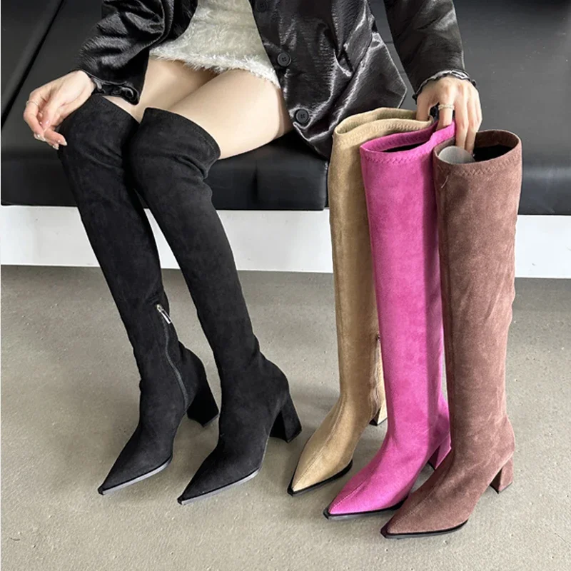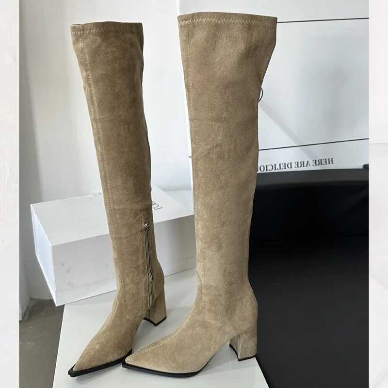 Eilyken Fashion Pointed Toe Over-the-Knee Boots Woman Square Heels Street Style Shoes Thigh High Zipper Long Booties