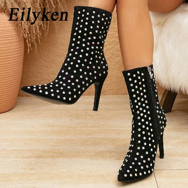 Eilyken Fashion Sexy Rhinestone Crystal Woman Ankle Boots Eelgant Thin High Heel Pointed Toe Side Zipper Shoes Botas De Mujer