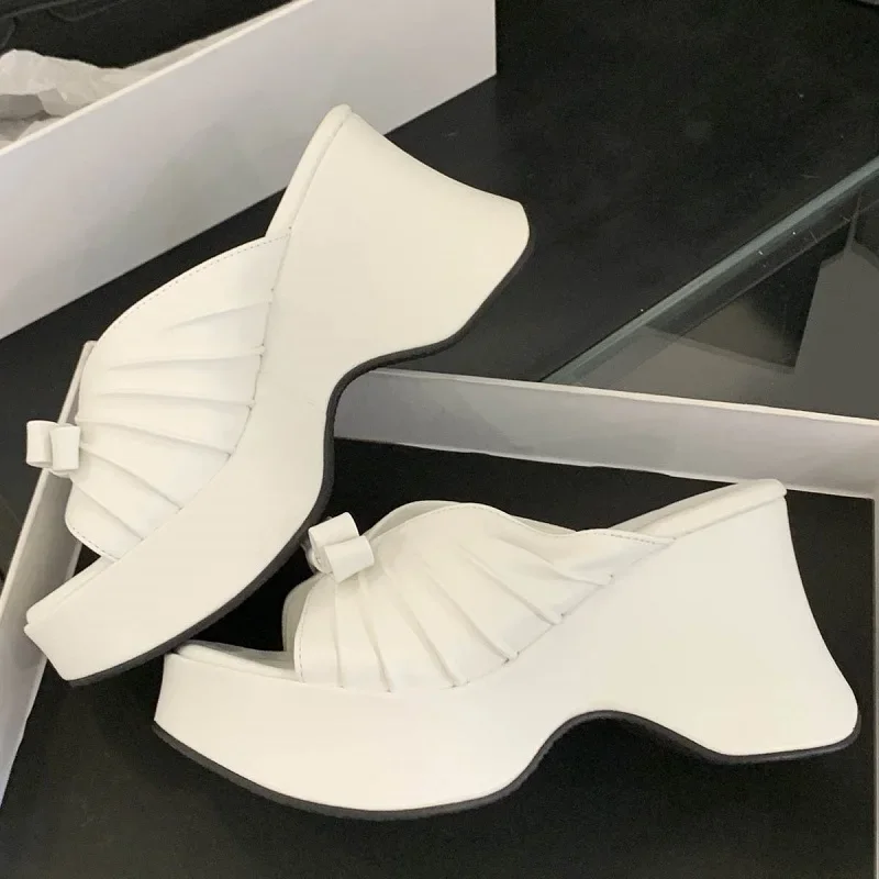 Eilyken New Design Pleated Butterfly-knot Platform Wedge Women Slippers Fashion Open Toe High Heels Party Shoes