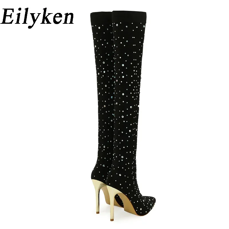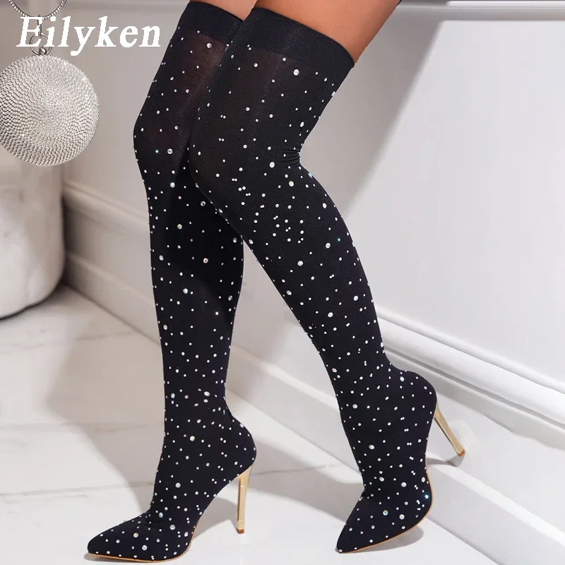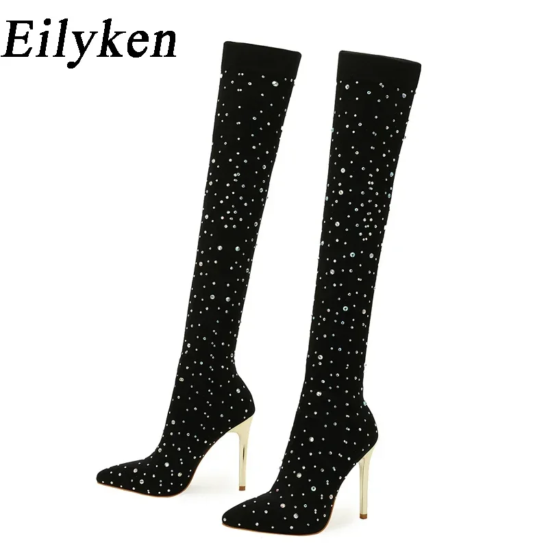 Eilyken Sexy Runway Crystal Stretch Fabric Sock Over the Knee Boot Thigh Stiletto High Pointed Toe Woman Shoes Zapatillas Mujer