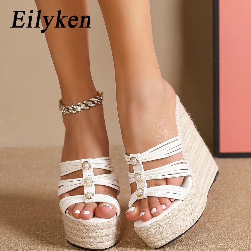 Eilyken Summer Fashion Pearl Platform Wedges Open Toe Slippers Women Narrow Band Grass Weave Slide Shoes