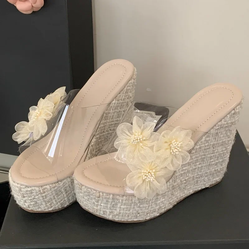 Eilyken Summer Open Toe Platform Wedges Slippers Women Fashion Flower PVC Transparent Thick Bottom Heels Slide Shoes