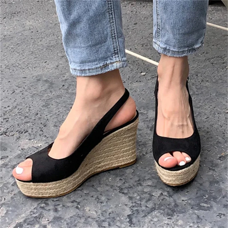 Eilyken Summer Peep Toe Buckle Strap Women Slippers Fashion Solid Platform Wedges Heels Rattan Weave Sandals Shoes