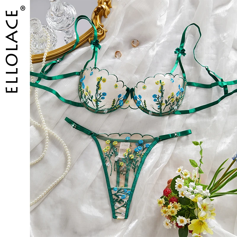 Ellolace Elegant Sexy Female Lingerie Intimate Coquette Green Embroidered 2PC Set Tiny Floral Bowknot Youth Girl Pure Desire