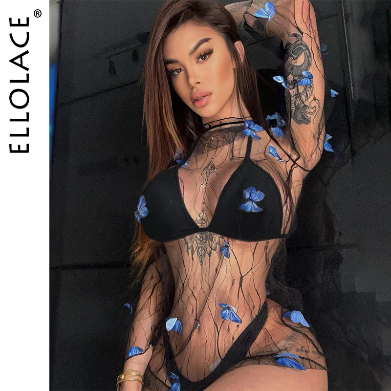 Ellolace Hot Sexy Clothes Women Micro Underwear with Mesh Dress Blue Butterfly See Through Fantasy Onlyfans Kit Holiday Outfit