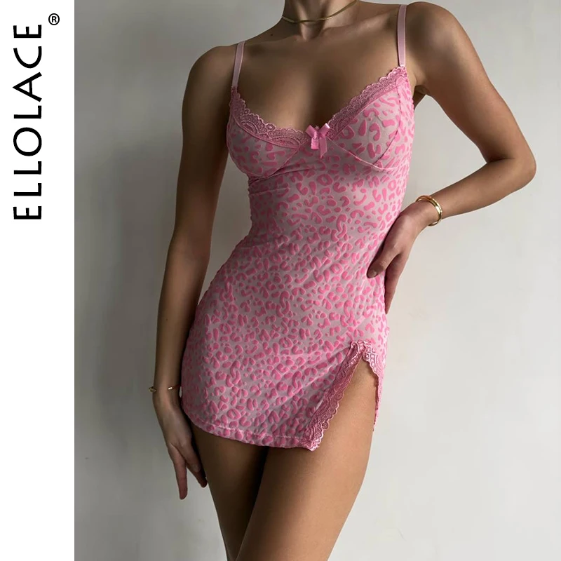 Ellolace Sensual Women’s Dress Beautiful Deep-V Neck Lace Split Sets Sheer Leopard with Thongs Sleepwear Babydoll Party Mini Kit