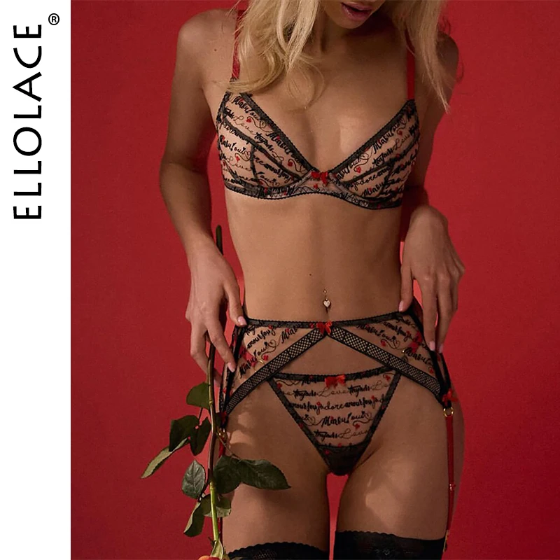 Ellolace Sexy Female Lingerie Fancy g-String Women Underwear Heart Letters Embroidery 3-Piece Exotic Youth Outfits