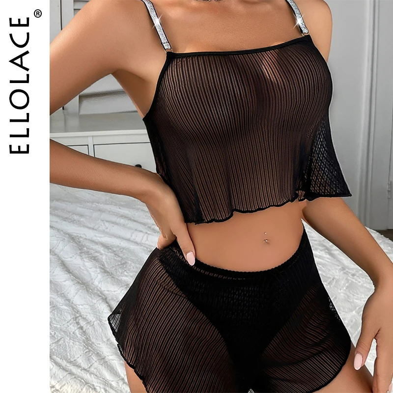 Ellolace Sexy Female Lingerie Shiny Rhinestone Straps 3PCS Mesh Set Sensual Sheer Sleepwear Pure Desire Women’s Underwear