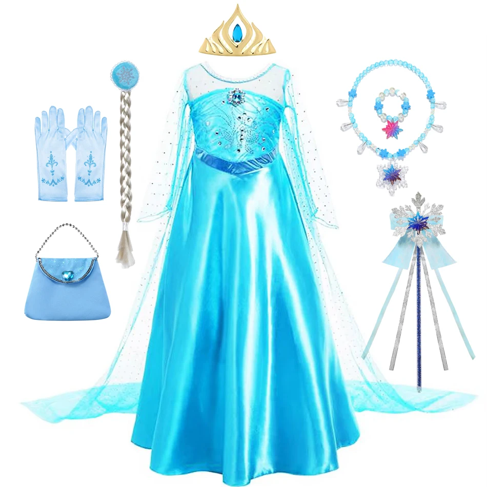 Princess Elsa Costume Dress For Children Girls Snow Queen Travel Costume Fancy Blue Long Sleeve Dre...