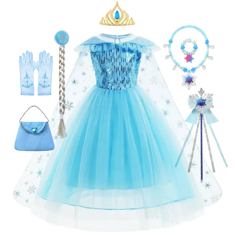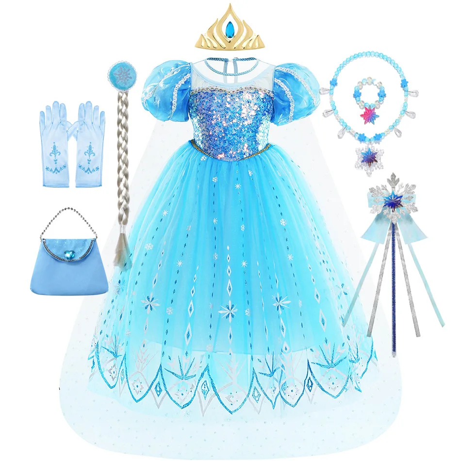 2-10Y Elsa Princess Dress For Kids 2025 Girls Blue Mesh Snowflake Costume Dress Carnival Birthday P...