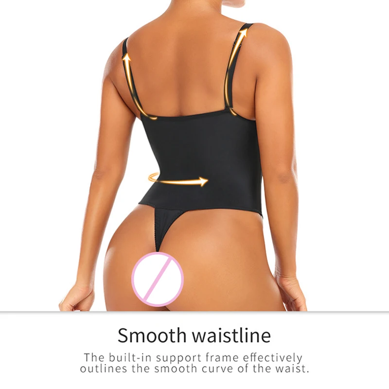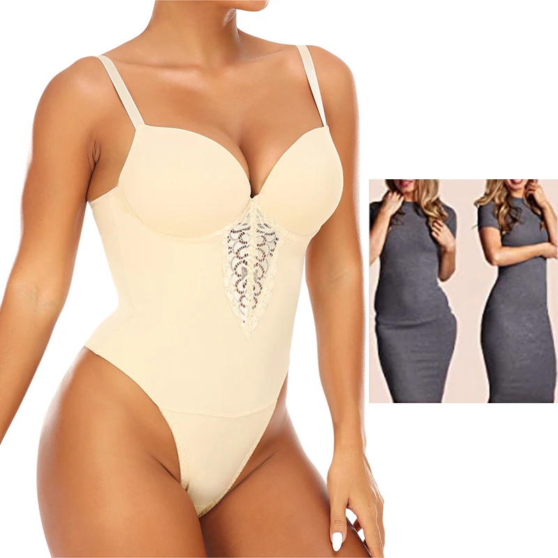 Women Deep V Neckling Light Shapewear Bodysuit Thong Body Shaper Lace Top Underwear Adjustable Stra...