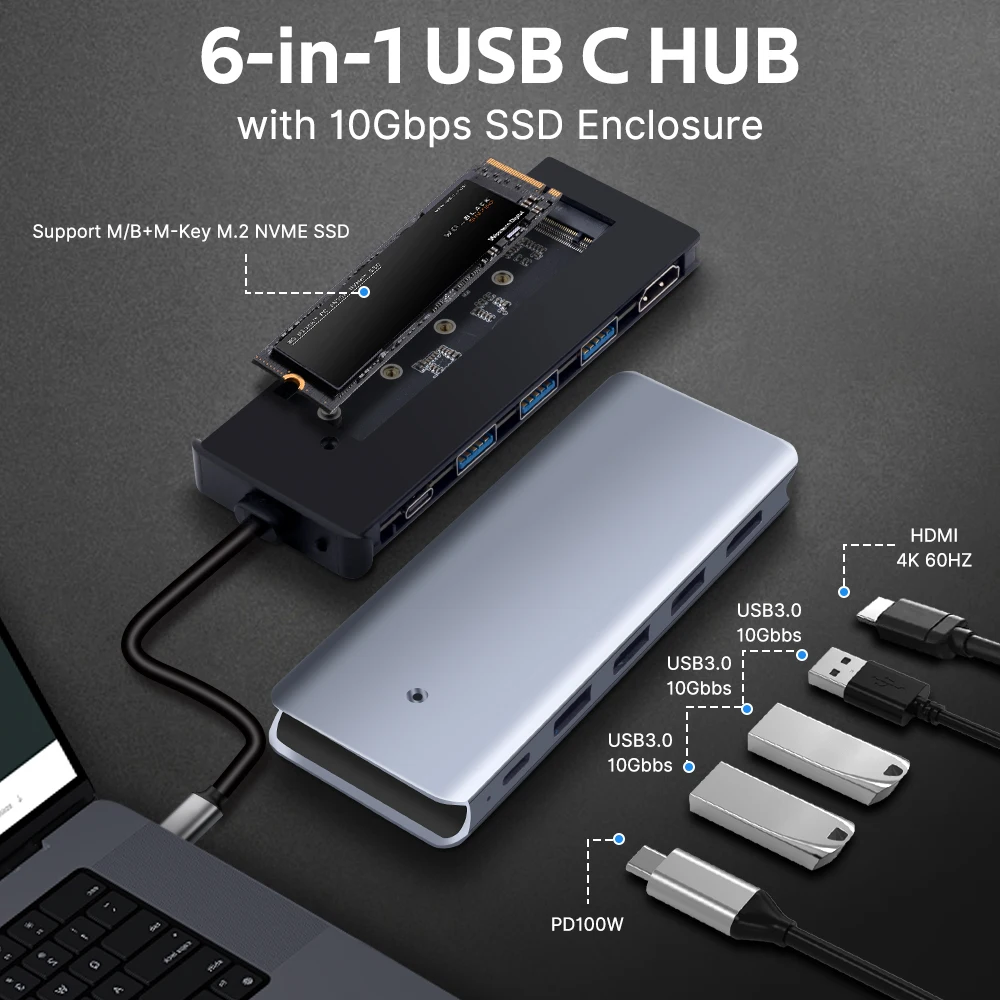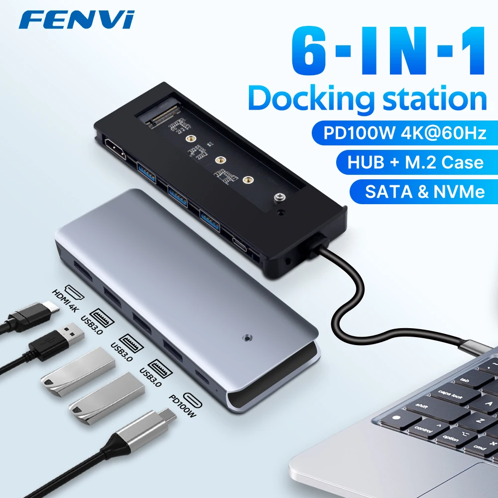 Fenvi 6 in 1 USB HUB M.2 NVMe SSD Hard Drive USB 3.0 Type C to HDMI-Compatible Adapter 100W PD For MacBook Pro Laptop PC