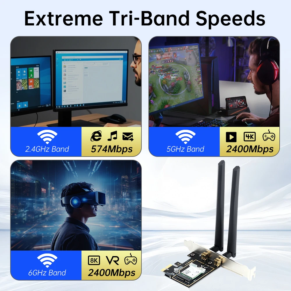 5.Wireless rate:2.4GHz: 574 MBPS; 5GHz: 2400 MBPS; 6GHz: 2400 MBPS