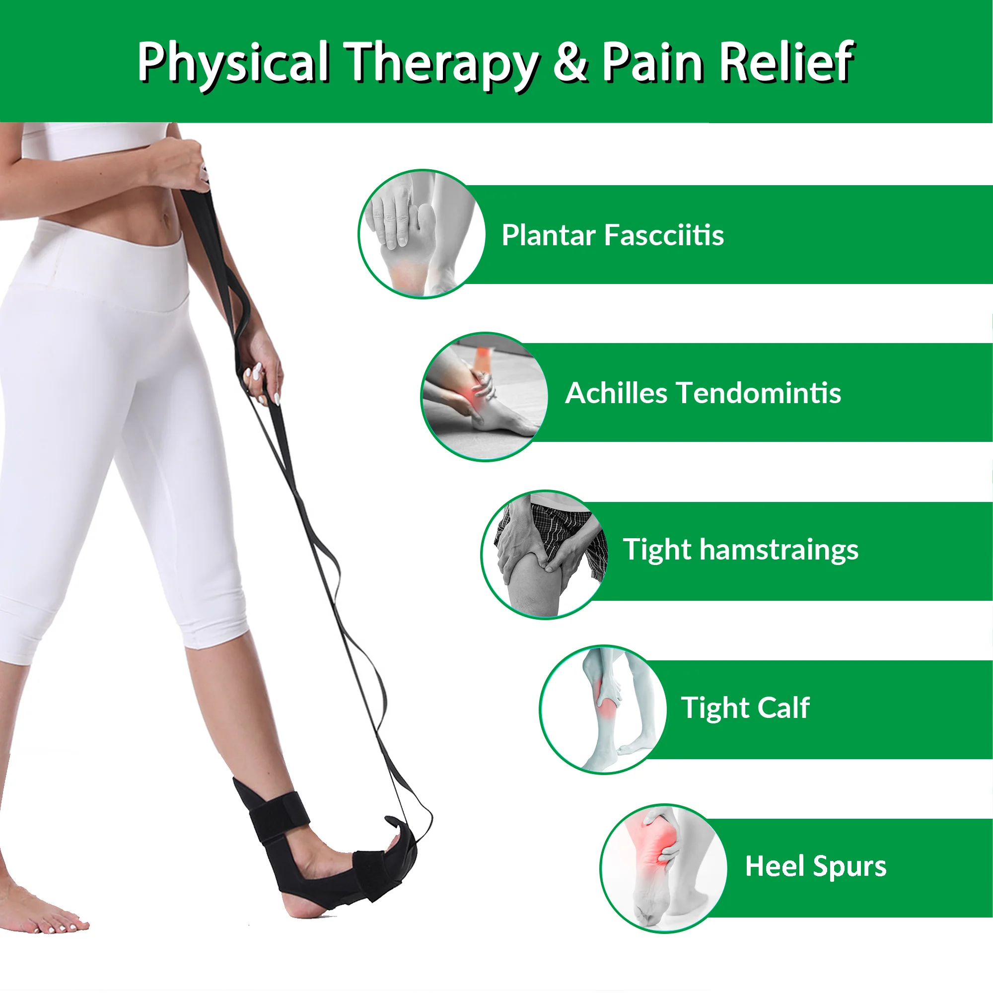 Exceptional physiotherapy leg stretching strap assists in the treatment of plantar fasciitis, heel spurs, calf, ankle, achilles tendonitis, hip and low back strains and injuries