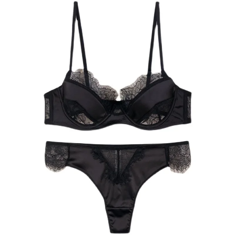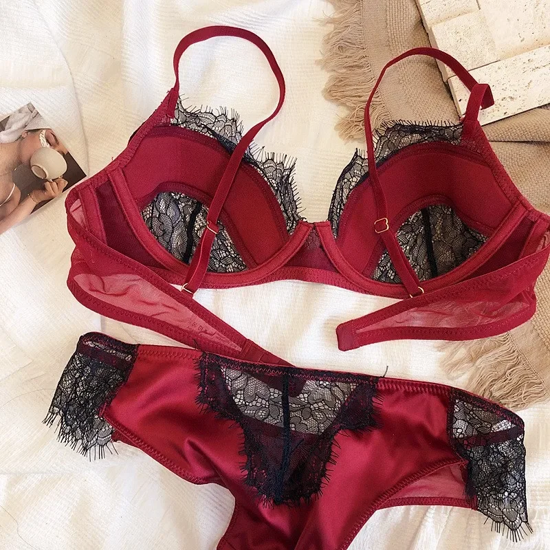 French Sexy Eyelash Lace Lingerie Summer Women luxury Style Contrast Color Patchwork Perspective Underwear Female Solid Bra Set