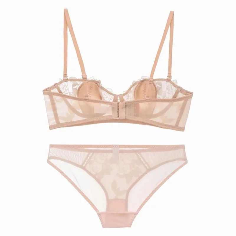 French Sexy Thin Rabbit Ear Cup Lingerie with Flower Embroidery Summer Women Sweet Lace Underwear Elegant See Through Bra Briefs