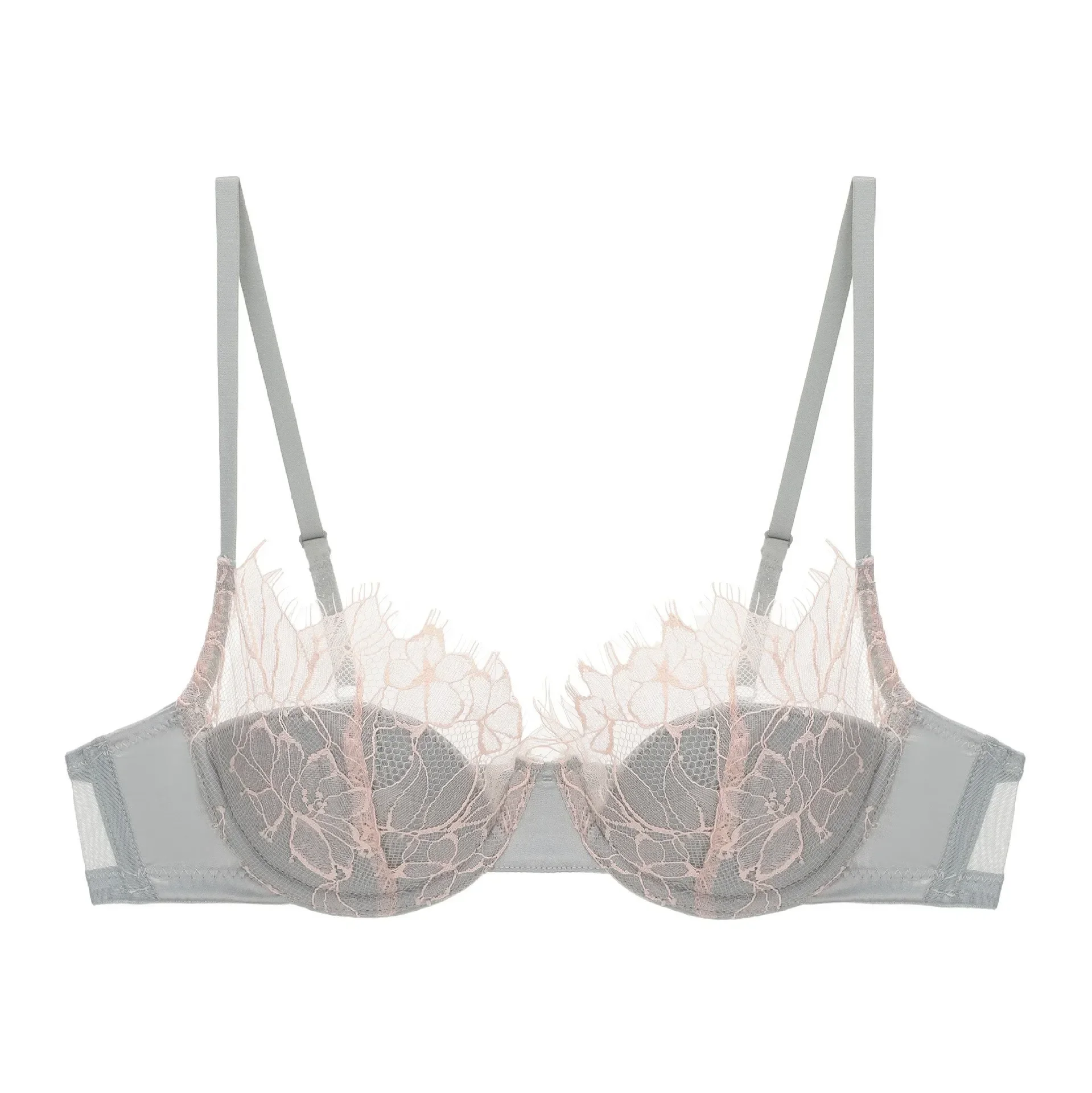 Sexy Mesh Smooth Chest Gathering Bra Women’s Thin Under Thick Mold Cup Lingerie Set Female So...