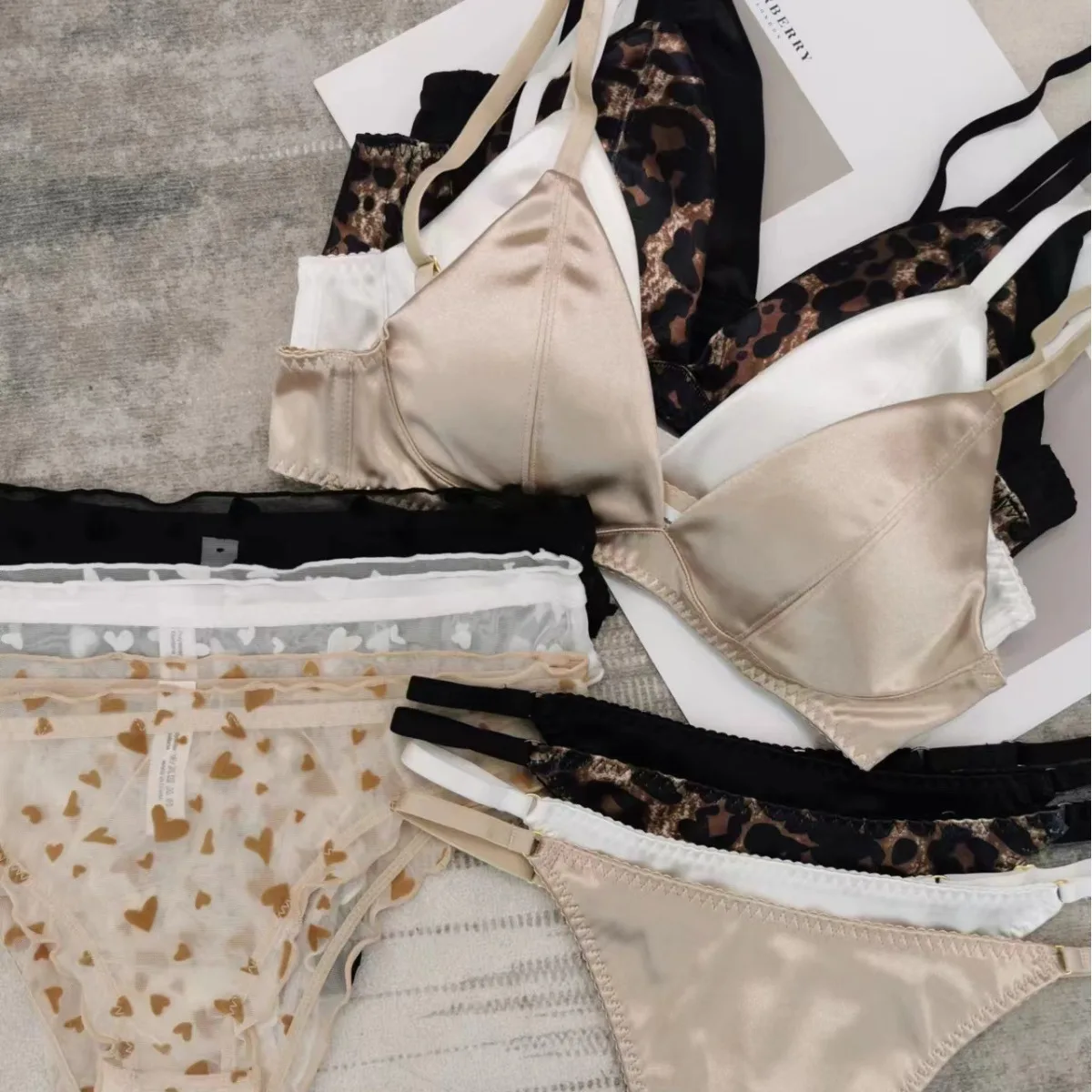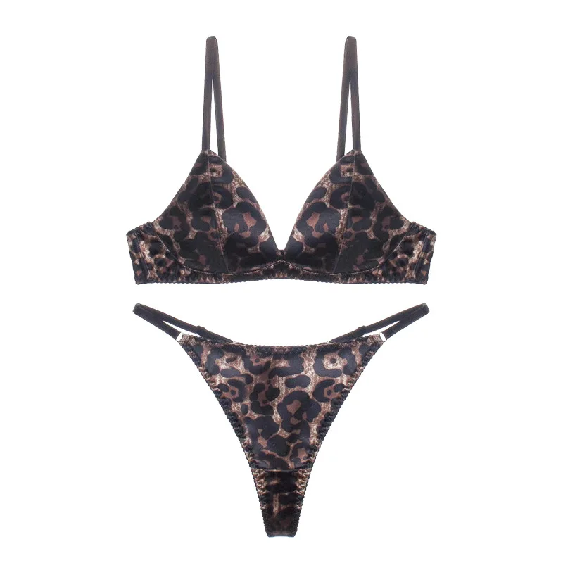 French Style Sexy Thin Seamless Satin Lingerie Set Women’s Triangular Cup Bra Without Steel Ring Female Leopard Print Underwear