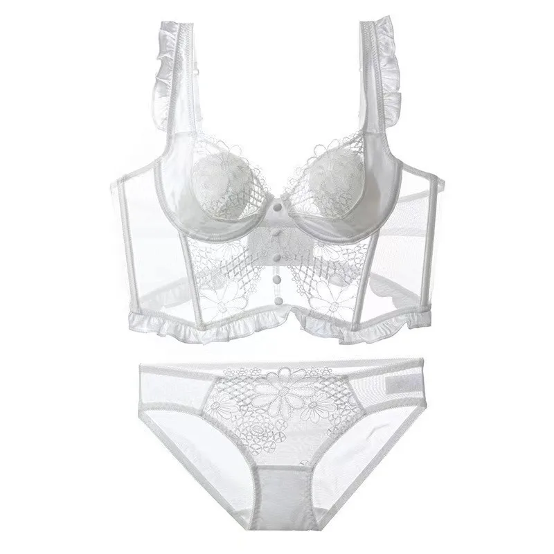 French Women's Sexy Corset Vest Briefs Suit Sweet Flying Sleeves Lace Patchwork Underwear Women's Soft Steel Ring Bra Everyday