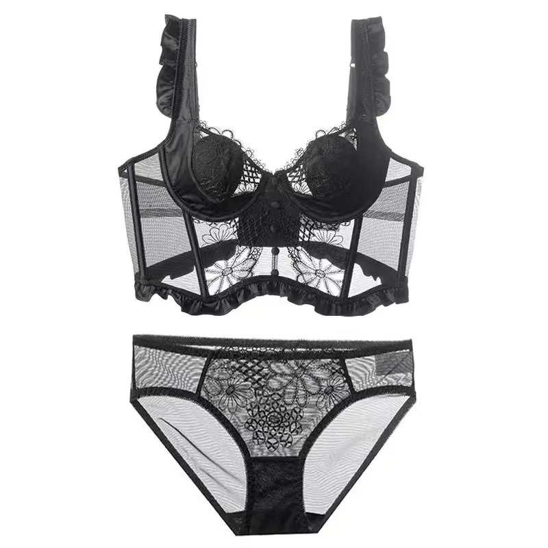 New Fashion Heavy Industry Embroidered Lingerie Set with Metal Buckle Women’s Sexy Perspectiv...