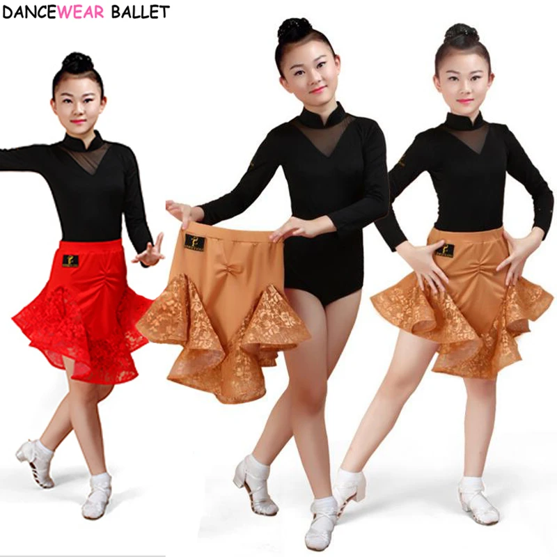 Girls Latin Ballroom Latin Dance Skirt Sumba Rumba Salsa Tango Skirts Kid Child Lace Latin Dance Split Dress With Leotard Skirt