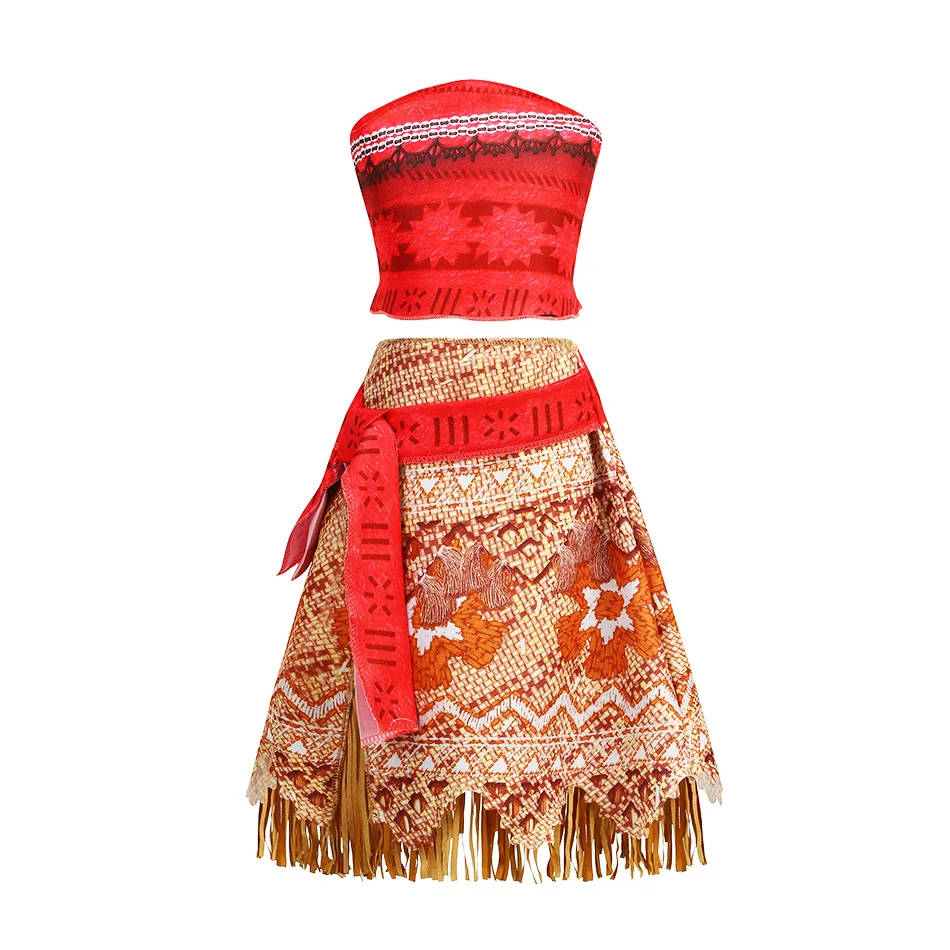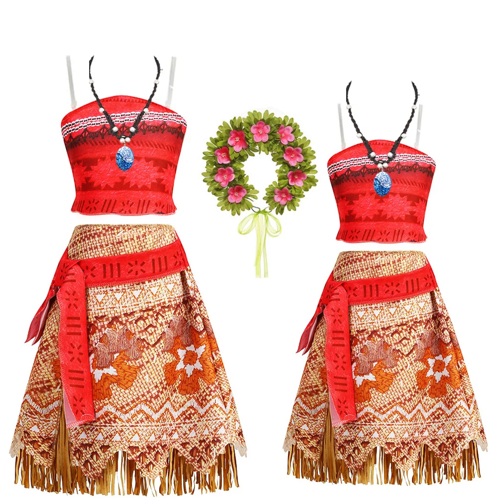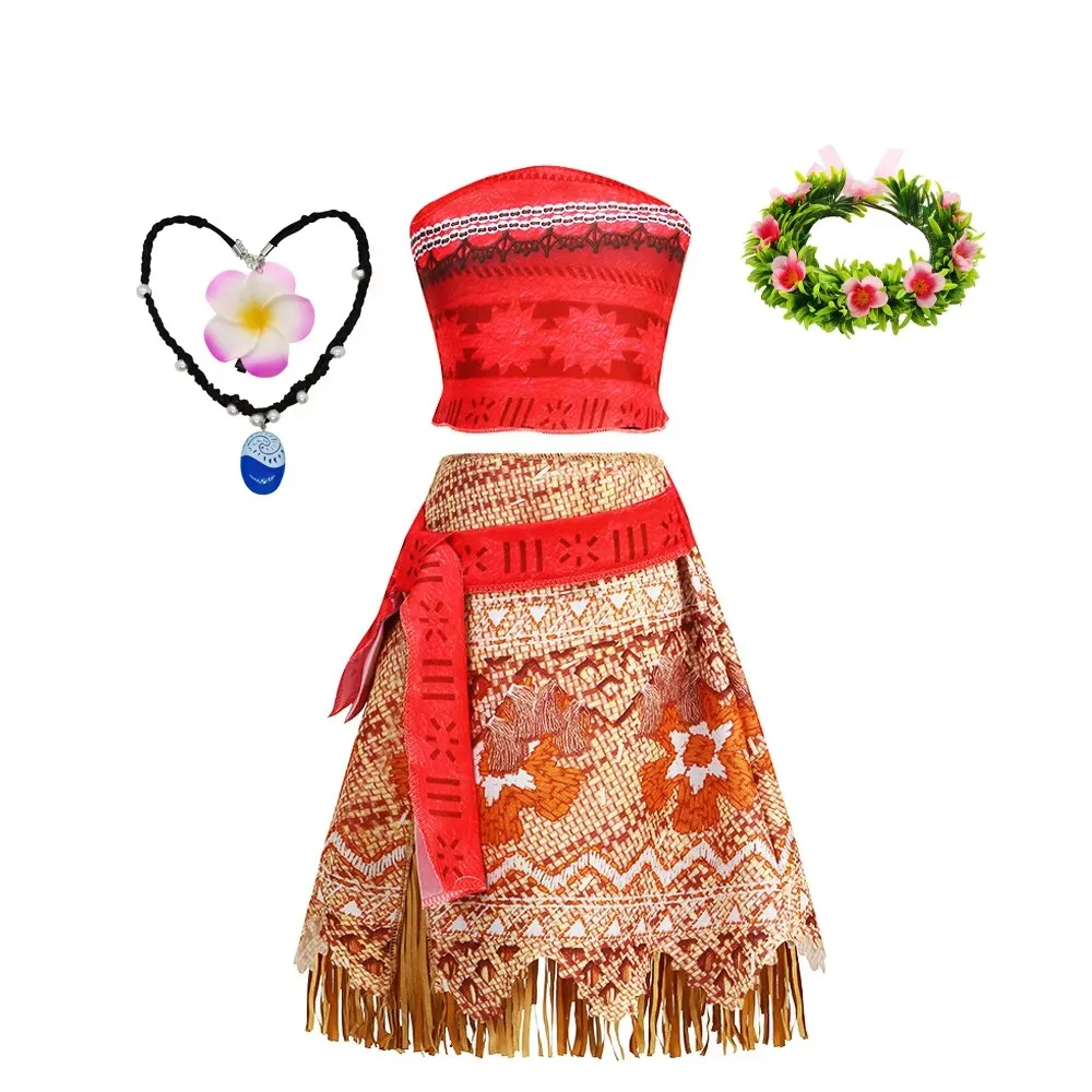 Girls Moana Costume Outfit Children Cosplay Princess Dress Summer Casual Beach Dress Necklace Wig Set Party Dresses For Girls