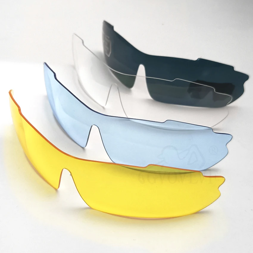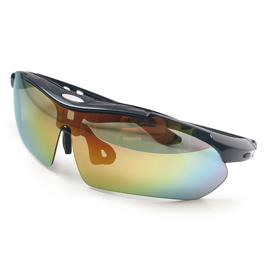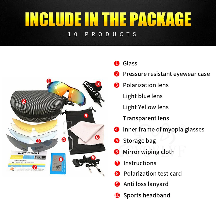 nterchangeable Lenses 5 Colors Glasses:The riding running polarizedsport sunglasses can be equipped with optical glasses,5 different functions Interchangeable Lenses.The Main one is colourful lense ,the yellow one is for night activities,the balck one is polarized for driving and other activities.the transparent one is for cloudy and rainy weather activities, the blue one is for severe pollution or foggy weather activities. PC lens and frames are impact, scratch resistant and unbreakable.