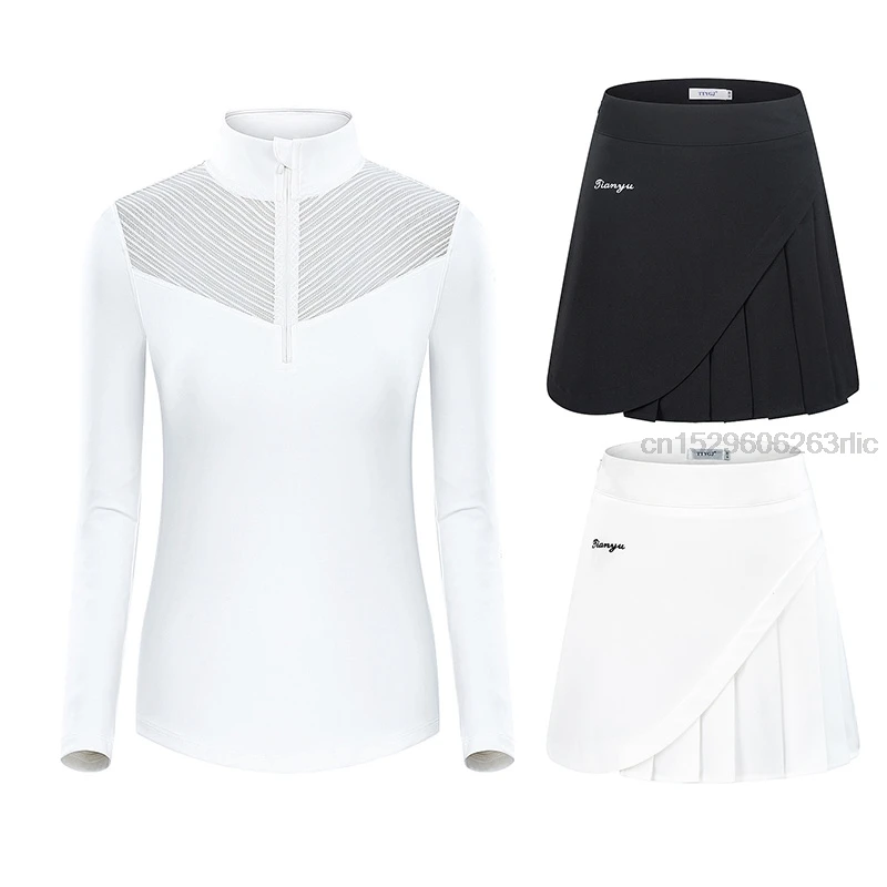 Golf Women T-Shirt + Skirt Lady Sportswear Sexy Lace Golf Wear Gym Slim Zipper Neck Shirt Pleated Skirt Set Golf Clothing Suit
