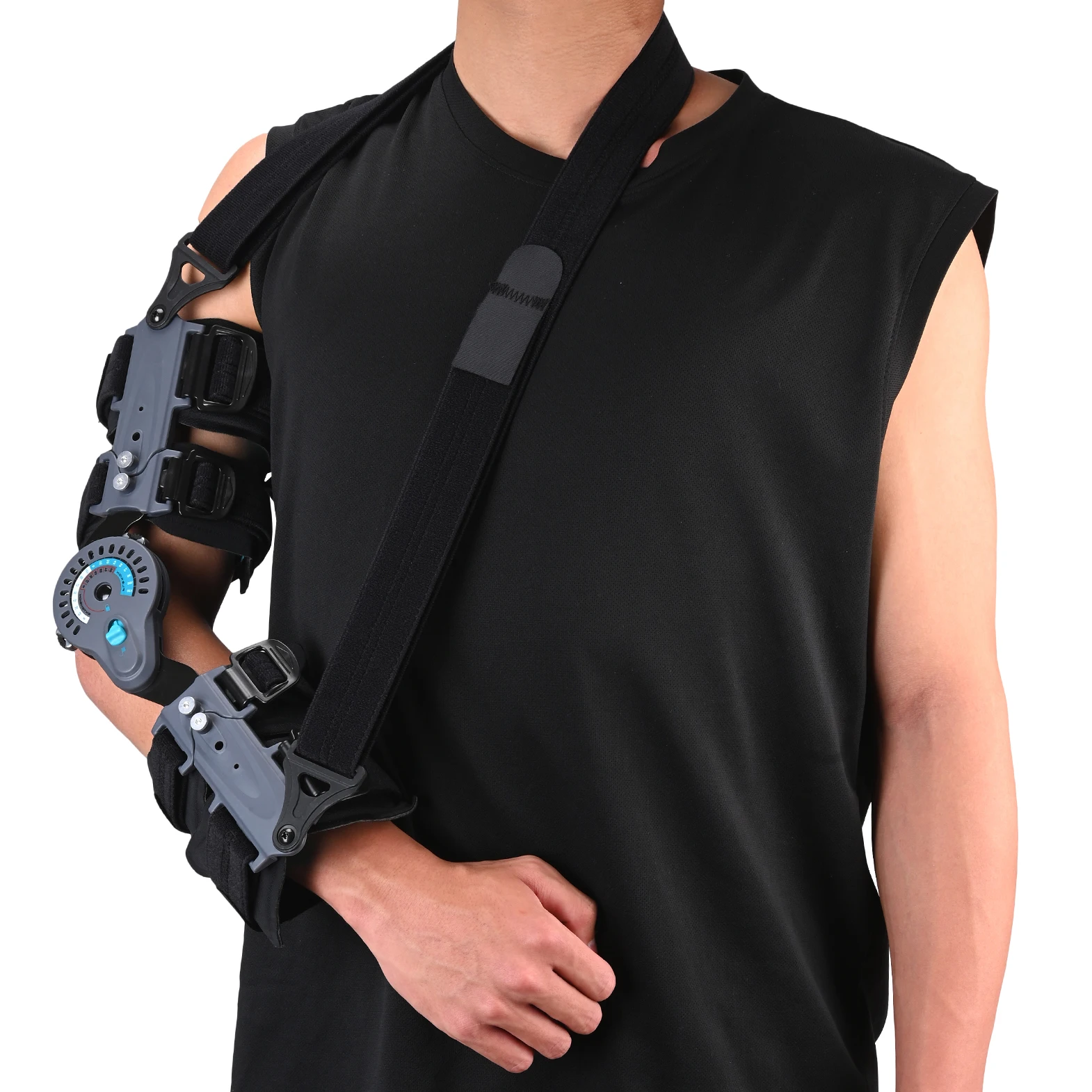Designed to rehabilitate elbow, ligaments and tendons post surgery, fractures and trauma. With the simple moving of a pre-marked dial the flexion and extension of the elbow can be adjusted in 15° increments. Allowing patients a specific control over the range of movement to increase mobility while ensuring protection for the recovering elbow. With the pull of a button the length of the bicep or forearm can be extended or shortened for a custom fit. The elbow brace also includes a sling that attaches to the elbow brace and suspends the arm and helps support the shoulder.