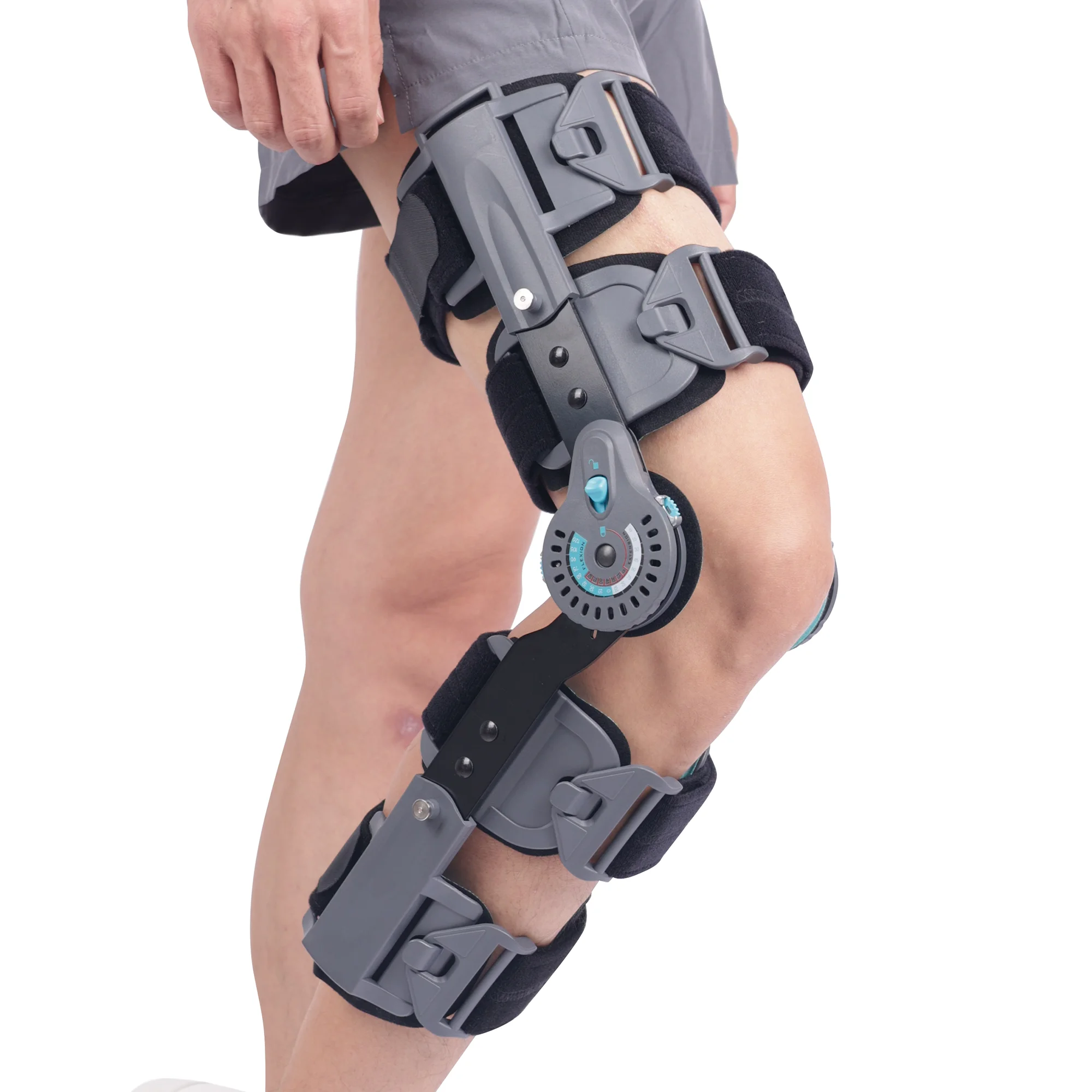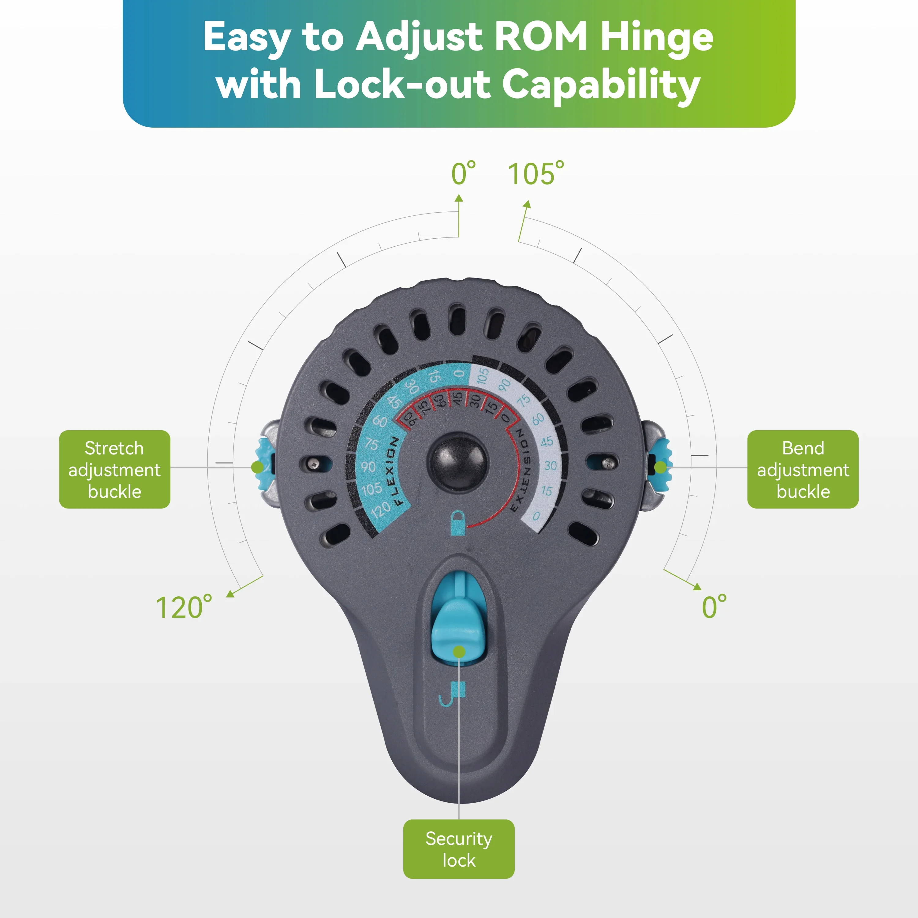 The bilateral range of locking dial can be set 0° – 120° of flexion and 0° – 105° of extension, the angle increases or decreases every 15°