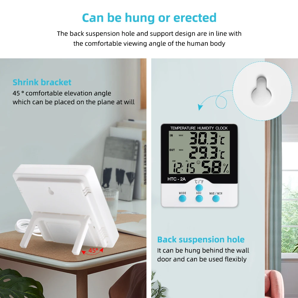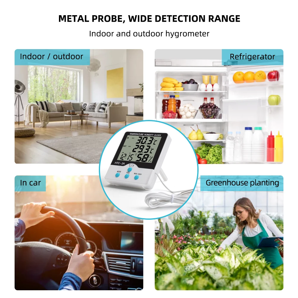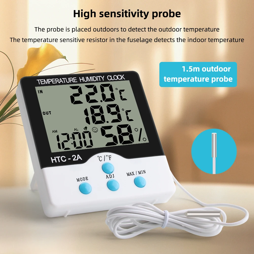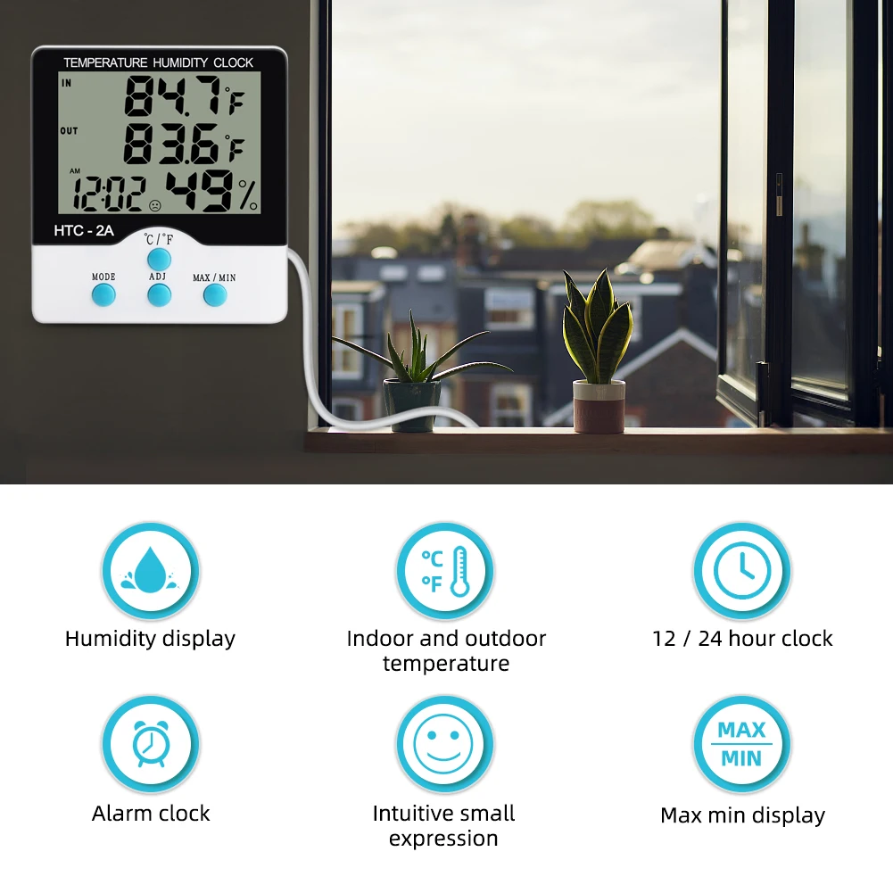 HTC-2A Digital Temperature Humidity Meter Alarm Clock Indoor Outdoor Thermometer Hygrometer Max Min Records for Greenhouse Room