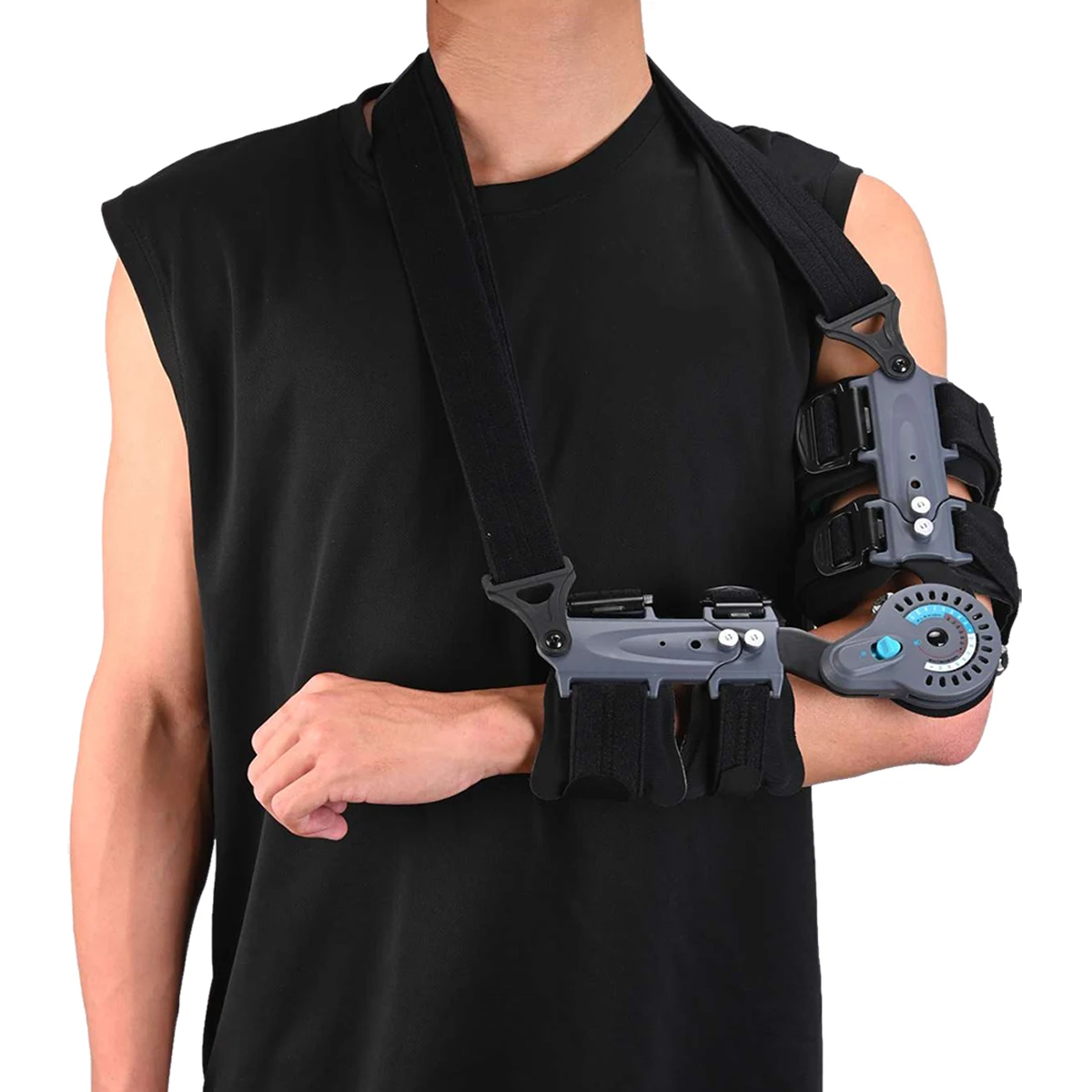 Designed to rehabilitate elbow, ligaments and tendons post surgery, fractures and trauma. With the simple moving of a pre-marked dial the flexion and extension of the elbow can be adjusted in 15° increments. Allowing patients a specific control over the range of movement to increase mobility while ensuring protection for the recovering elbow. With the pull of a button the length of the bicep or forearm can be extended or shortened for a custom fit. The elbow brace also includes a sling that attaches to the elbow brace and suspends the arm and helps support the shoulder.