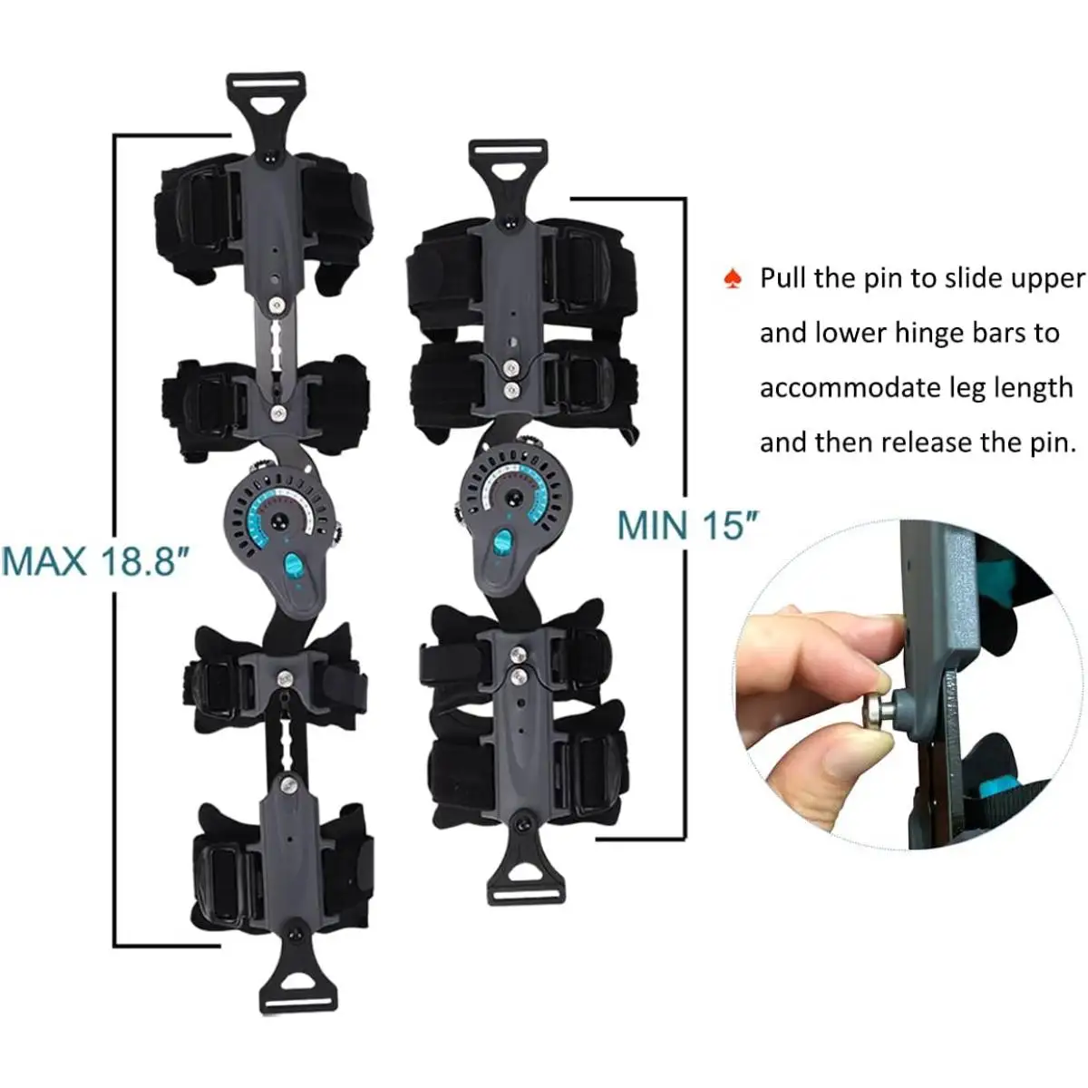 ● Simply press and rotate hinge with lock, Extension limitation from 0° ~ 105°, Flexion limitation from 0° ~ 120°, Lock limitation from 0° ~ 90°, Adjustable in every 15 degrees