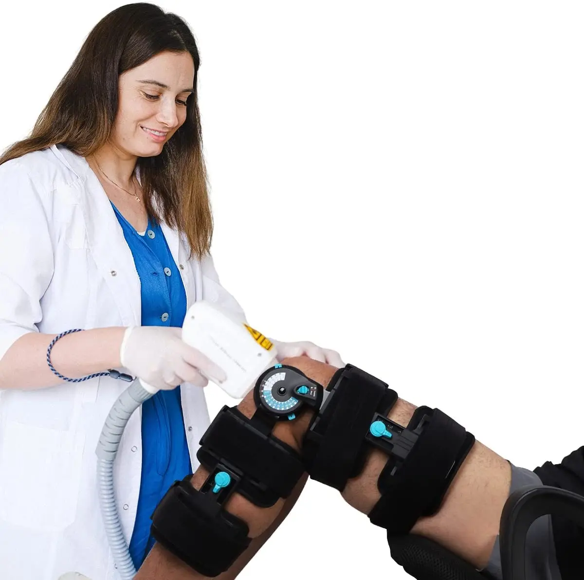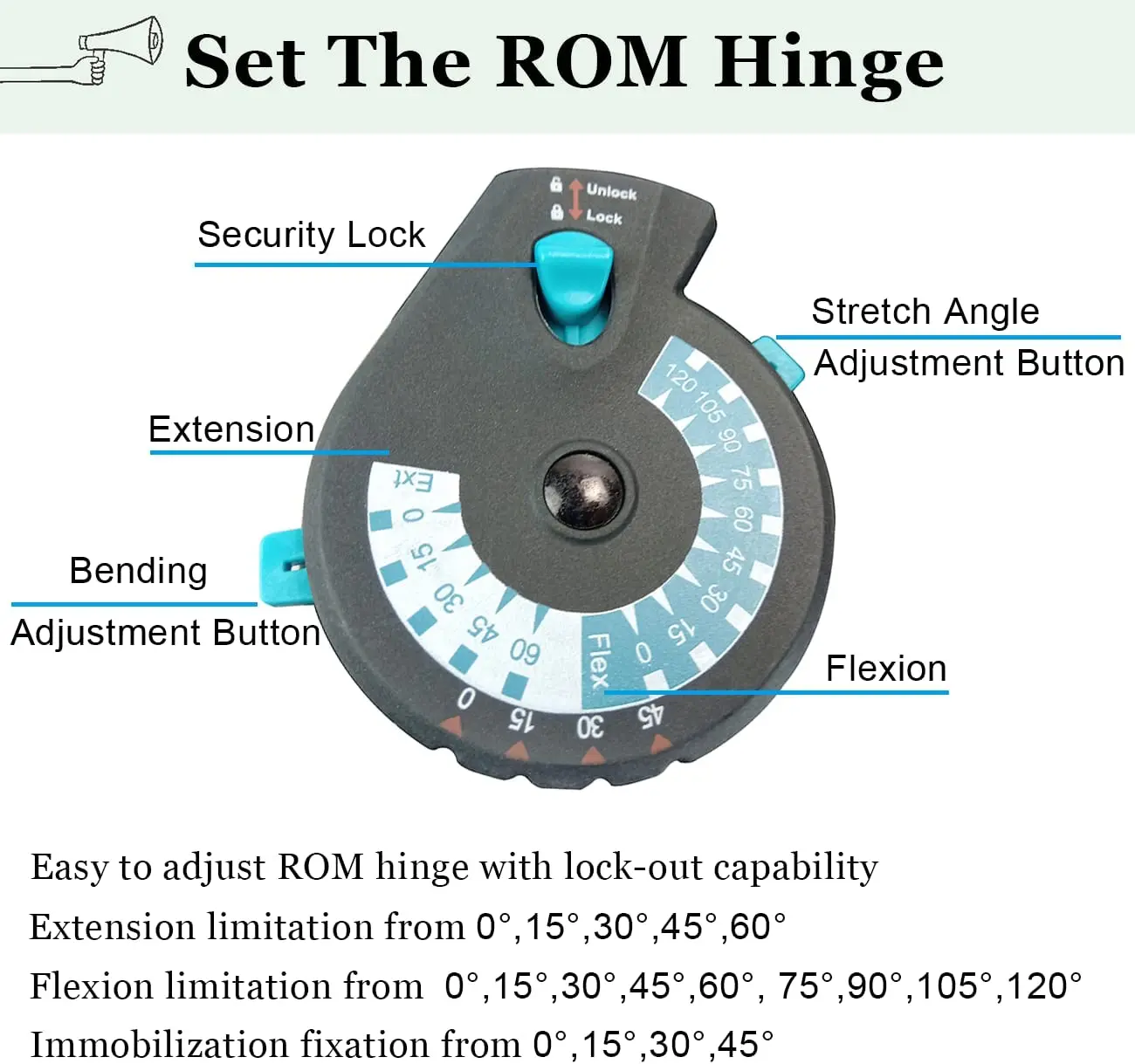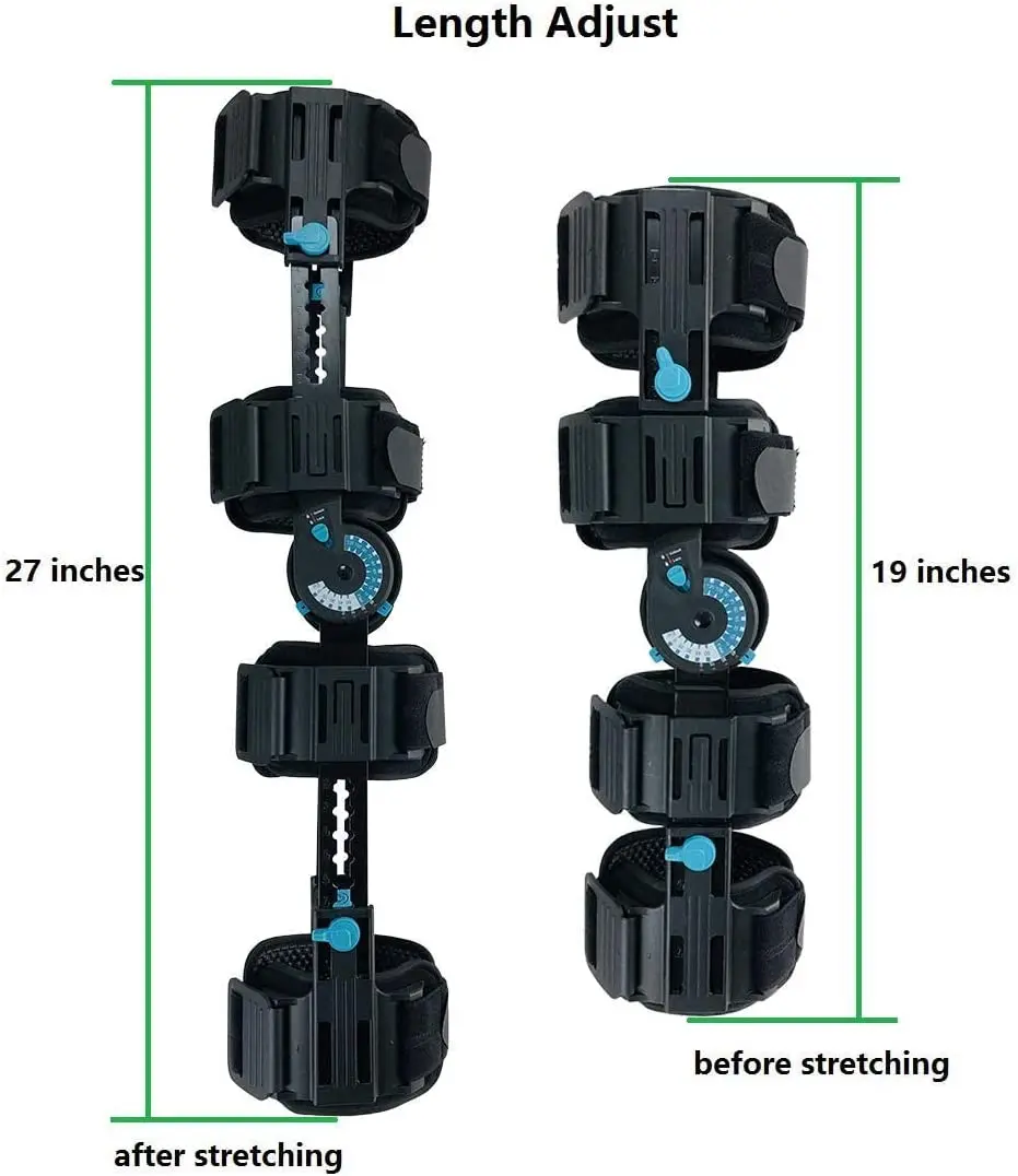Tool-free design, and collateral bars prevent valgus and varus deformity. Easy to use ROM hinge with quick-adjusting flexion and extension stops to control and limit knee flexion and extension. Quick-fit, gripping buckles for easy application