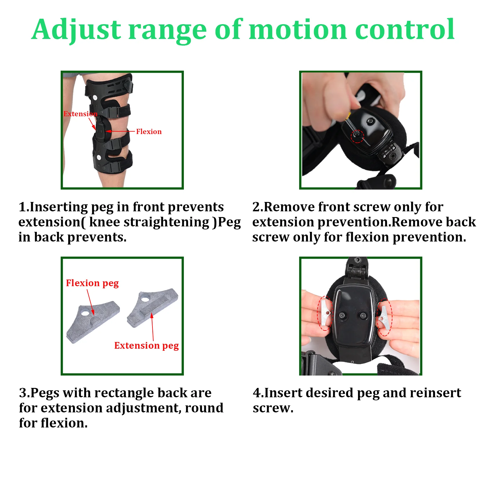 The unloading knee brace comes with 13 adjustable dial knee extension and knee flexion sliders that limit and prevent the knee’s hyperextension and flexion. Complete control with the range of motion adjustable dial and extension and flexion sliders.