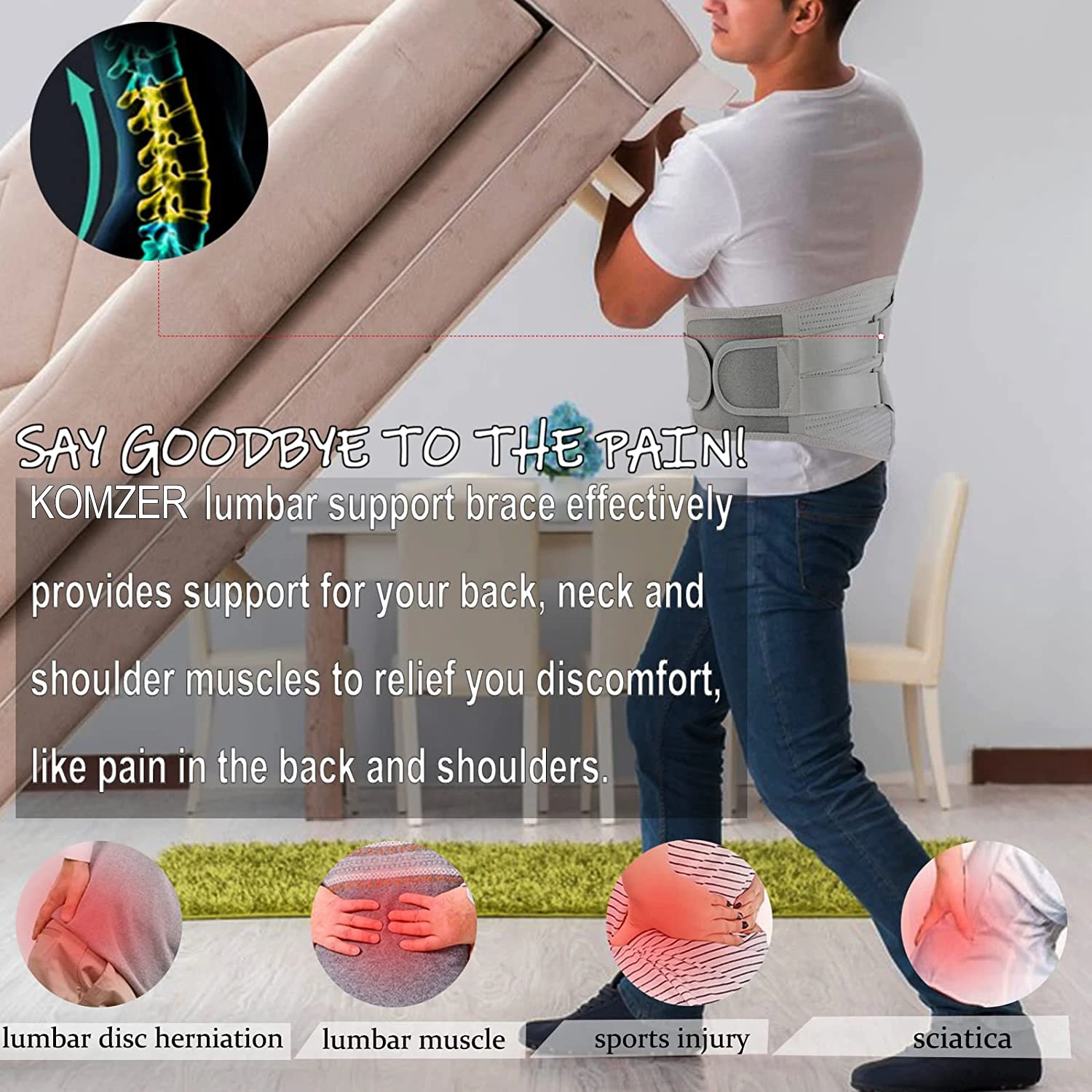 Comfortable fit and adjustable straps provide the best possible compression, heat retention and comfort. Ergonomically designed to provide extra support and lets the waist stay in the proper posture all the time. Komzer lumbar belts can pinpoint wearers’ lower back pain and holding the torso in a safe, supportive posture helps to relieve pain from lumbar disc, sciatica, muscular weakness, scoliosis, spinal stenosis, spondylolisthesis and other spinal problems.