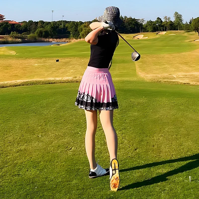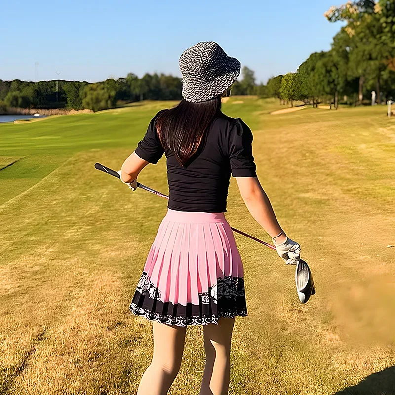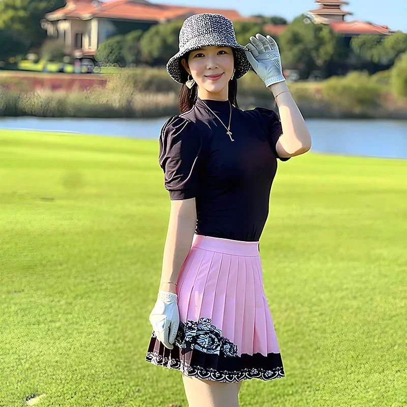 MG Golf Outfits Women’s Puff Sleeved Round Neck T Shirt Casual Slim-fit Shirt Quick-drying Breathable Golf Skorts Pleated Skirt