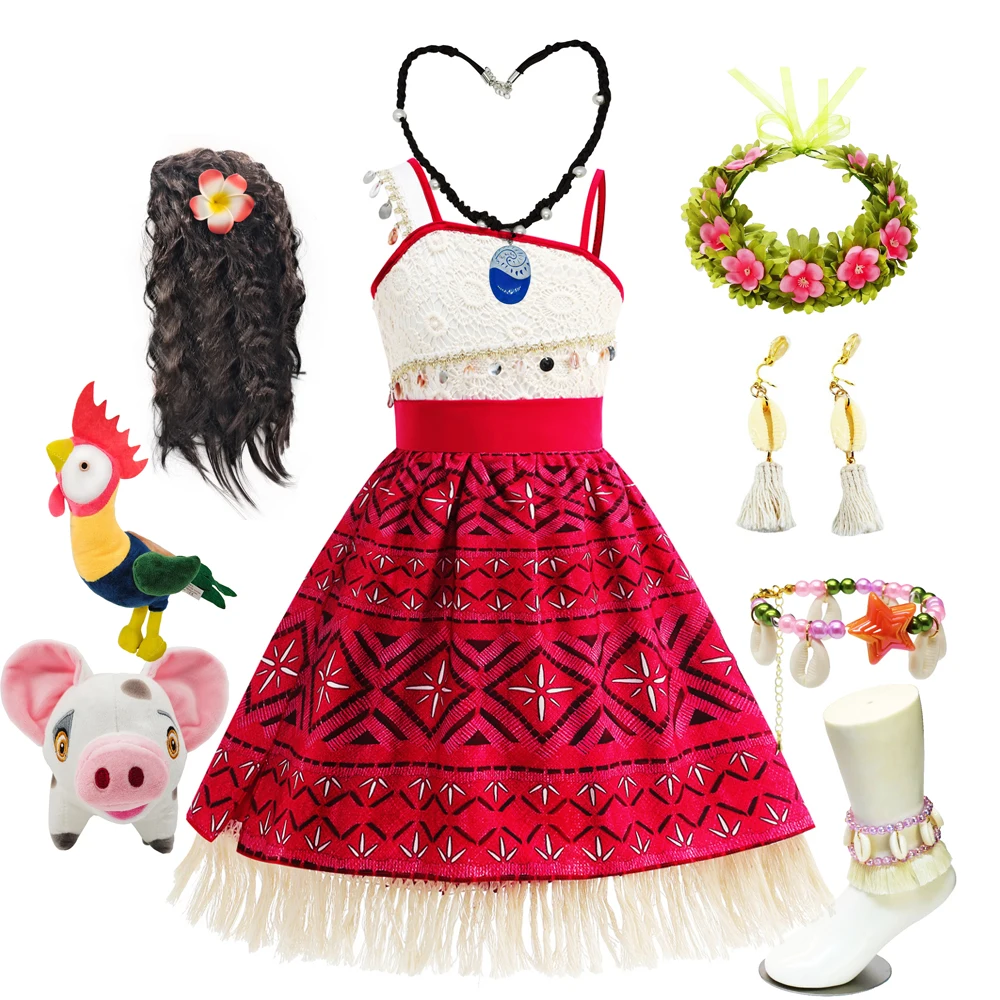 Moana New Dress Girls Princess Clothes Kids Dress Up Necklace Pig Chick Children Carnival Halloween Party Summer Costume Set