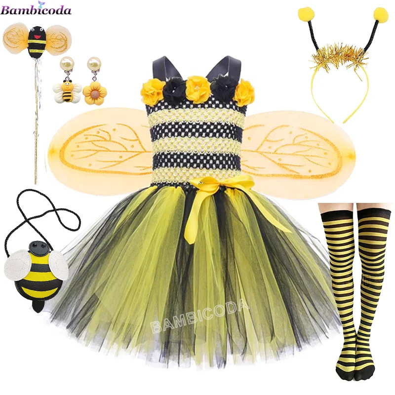 NEW Girls Cosplay Bee Costume Sleeveless Tulle Dress Headband Leg Warmers Wand Wing Sets for Cosplay Party Halloween Outfit