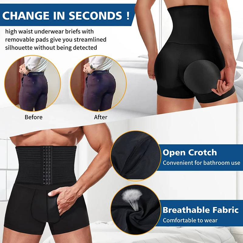 New Men Padded Boyshorts Butt Lifter High Waist Tummy Control Shorts with Buckle Hip Enhancer Compression Belly Shaper Panties
