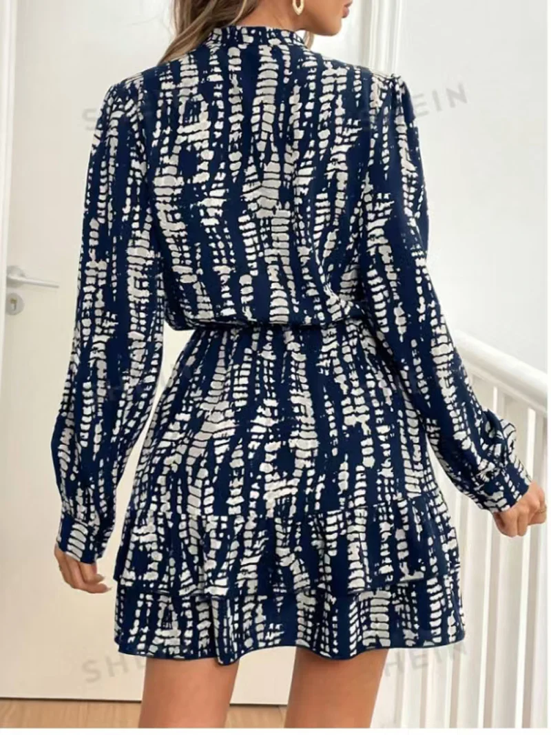 New Women’s Long Sleeve Printed Shirt Waist Cinched Dress Cross-Border Polyester Fiber Stand Collar Mini Midi Dress Regular Wais
