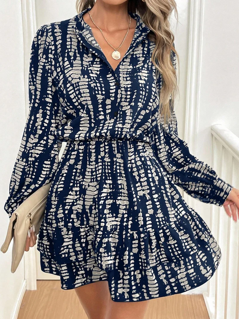 New Women's Long Sleeve Printed Shirt Waist Cinched Dress Cross-Border Polyester Fiber Stand Collar Mini Midi Dress Regular Wais