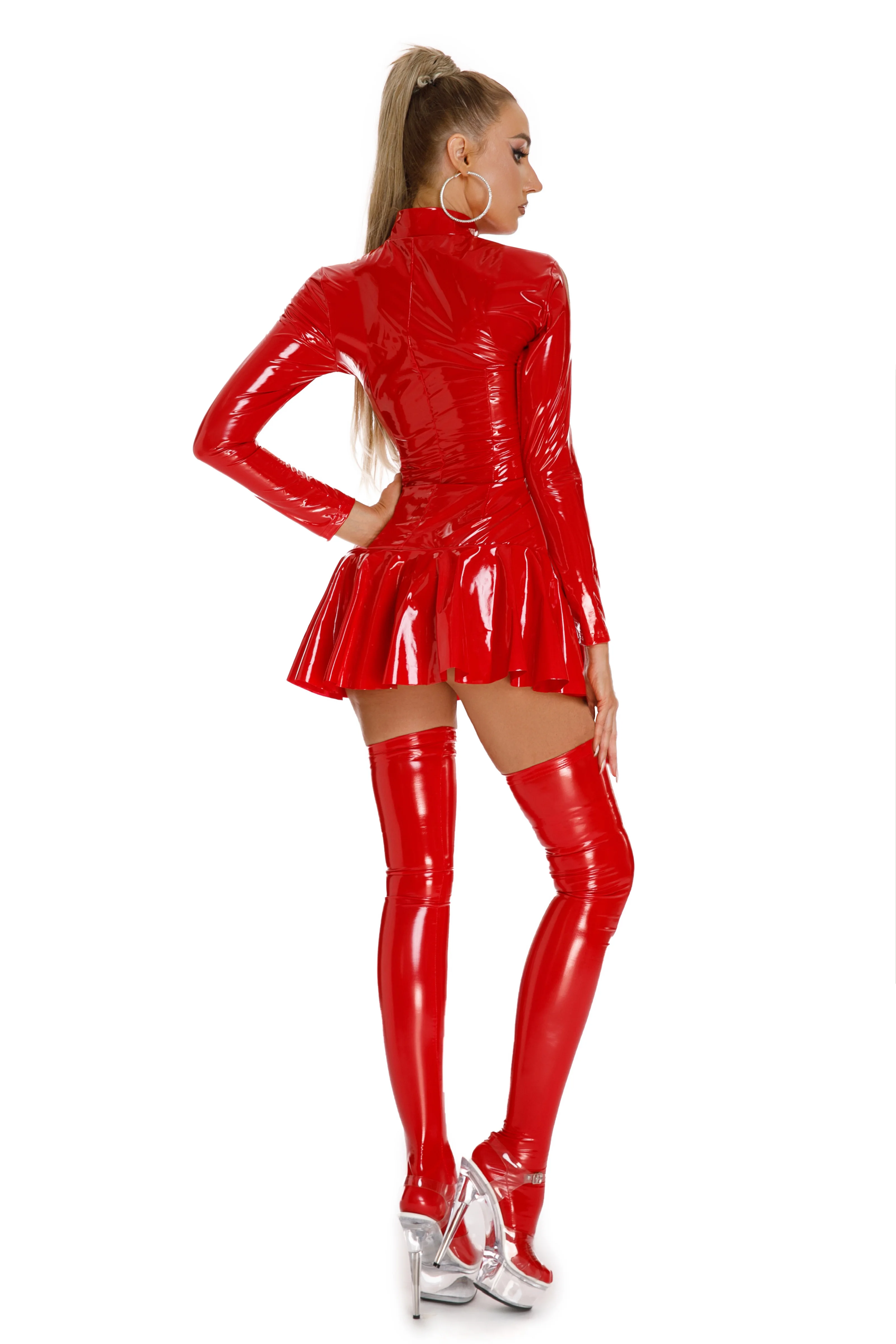 Plus Size Women Sexy Shiny Leather Dress with Stockings Long Sleeve Zipper Glossy Pvc Latex Mini Skirt Red Black