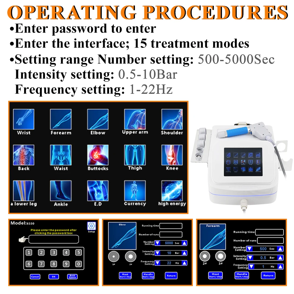 4. Shockwave therapeutic machine, humanized design provides setting, easy to operate; Quality power supply ensures immediate impact output.