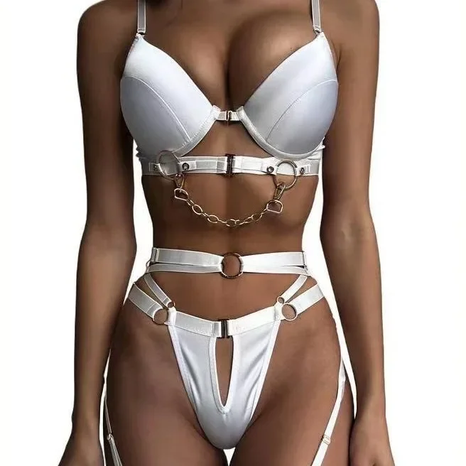 Sexy Fashion Exotic Apparel Suit with Metal Chain Motorcycle Accessories Women Solid Four Piece Set Front Open Button Underwear